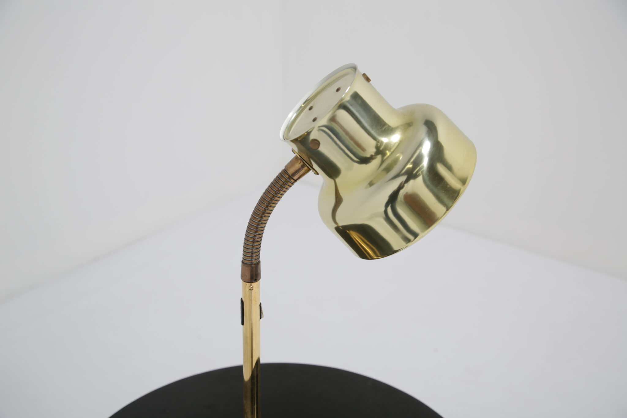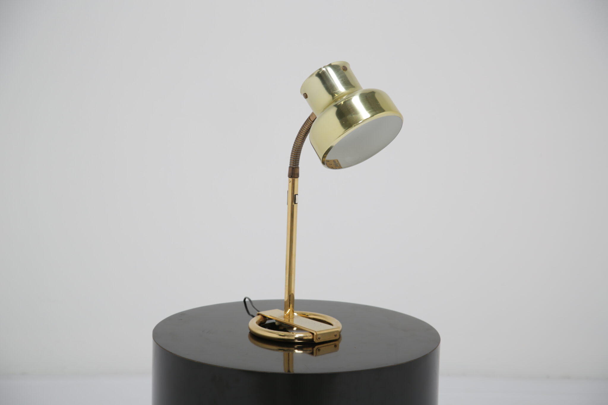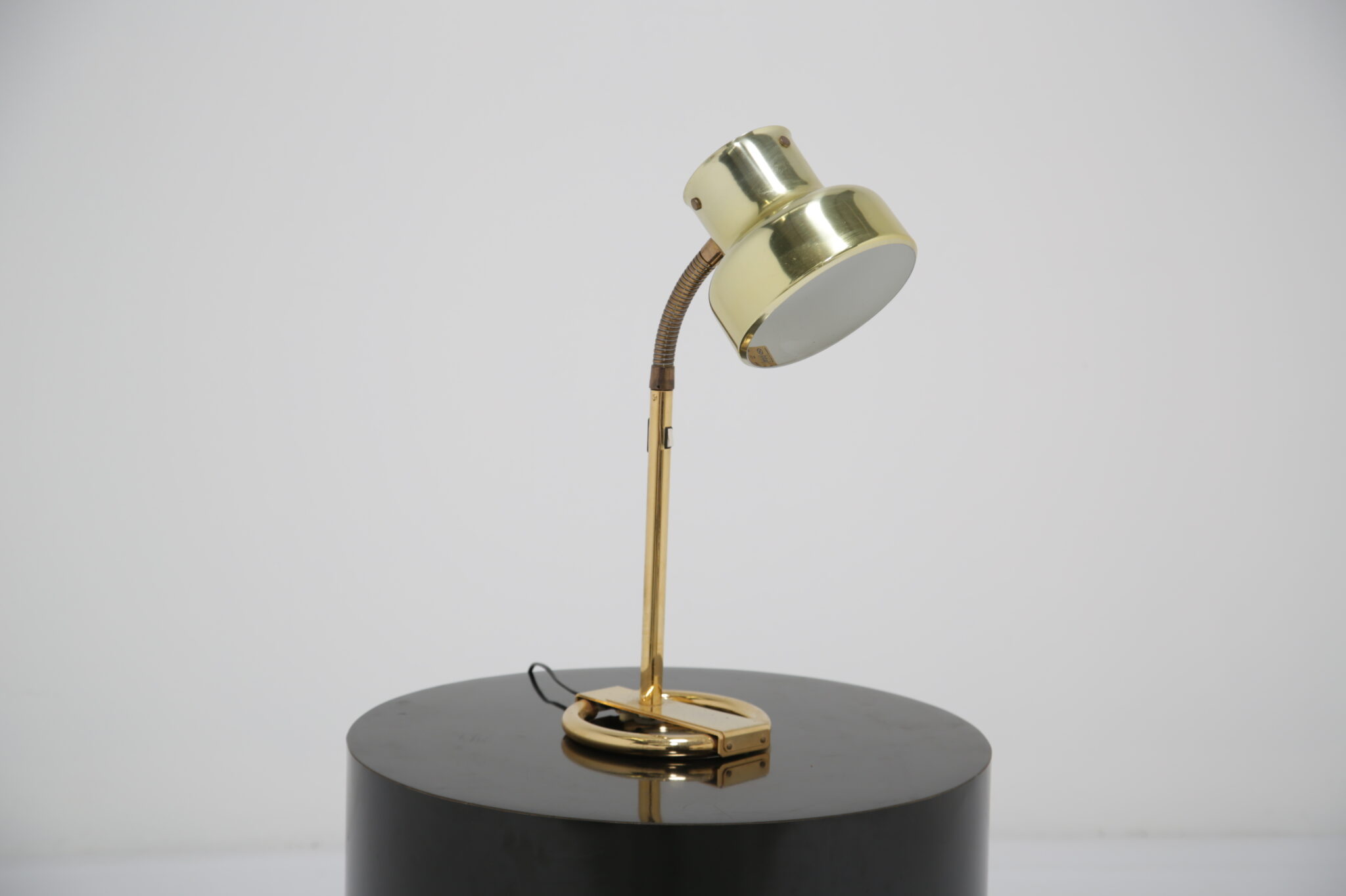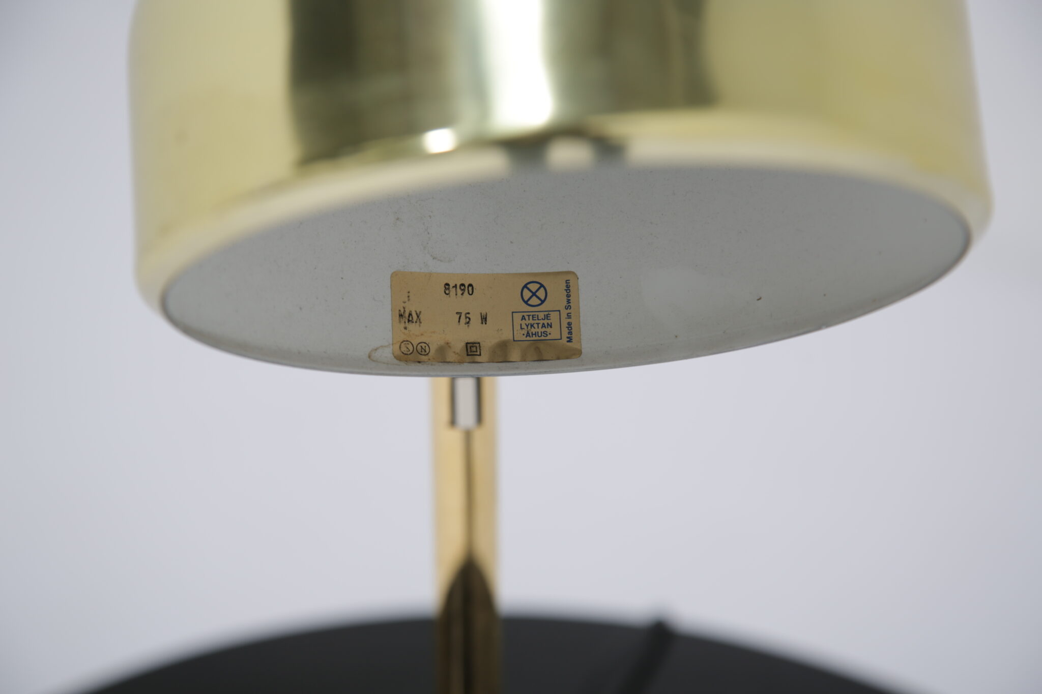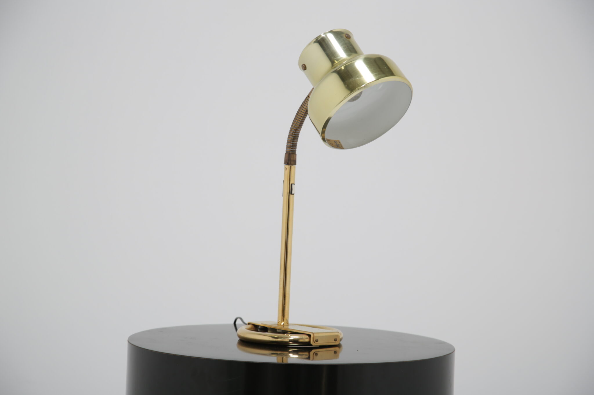 Add some vintage charm to your desk with this simple and beautiful desk lamp designed by the renowned Swedish lighting designer Anders Peherson for Atelje Lyktan (Translated to Studio Lighting). Dating back to the 1960s, but probably stretching into the 1970s this stunning desk lamp features a gold painted metal frame with a painted aluminum head. It illuminates the light nicely and would be perfect as a reading lamp.