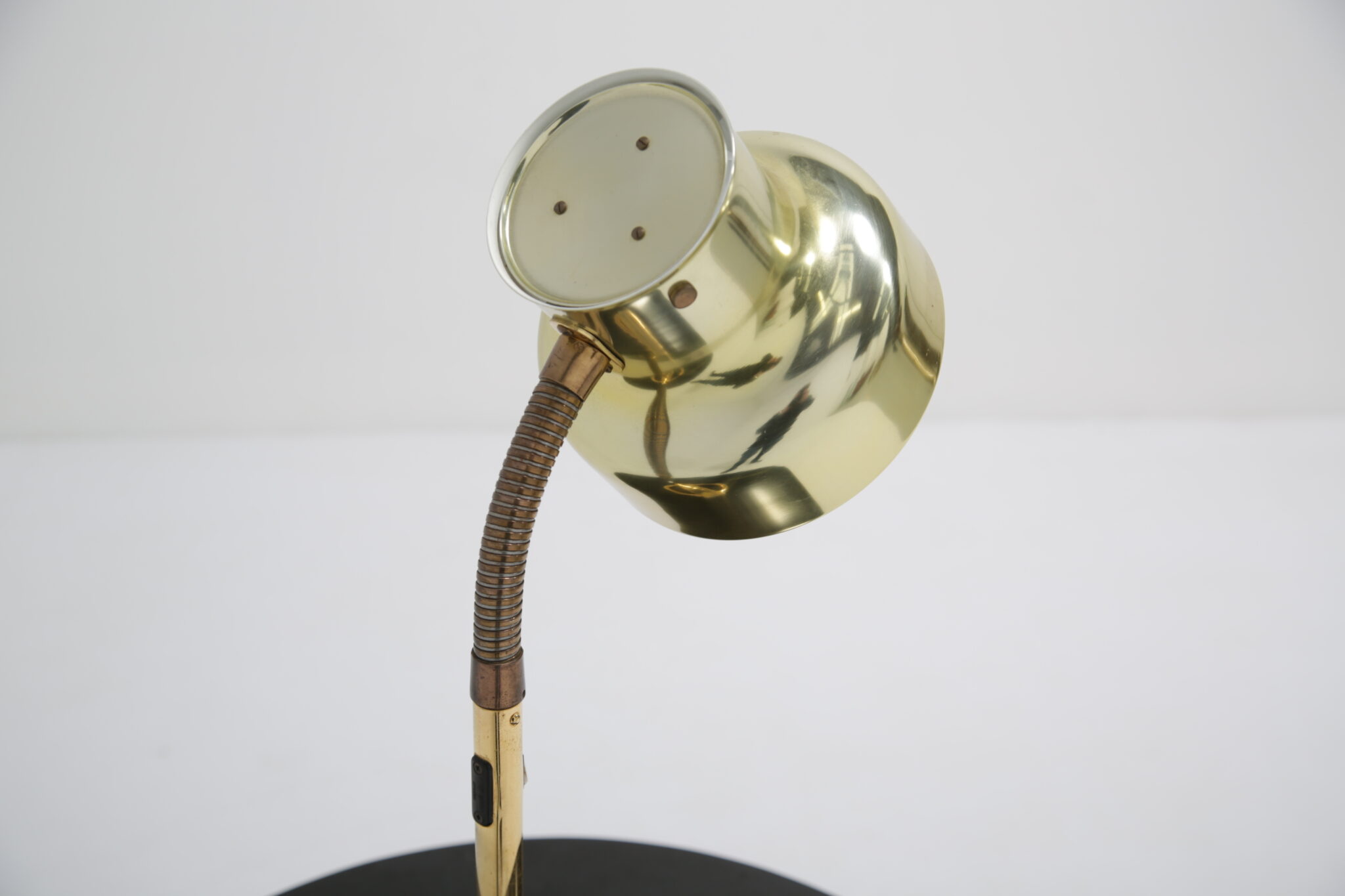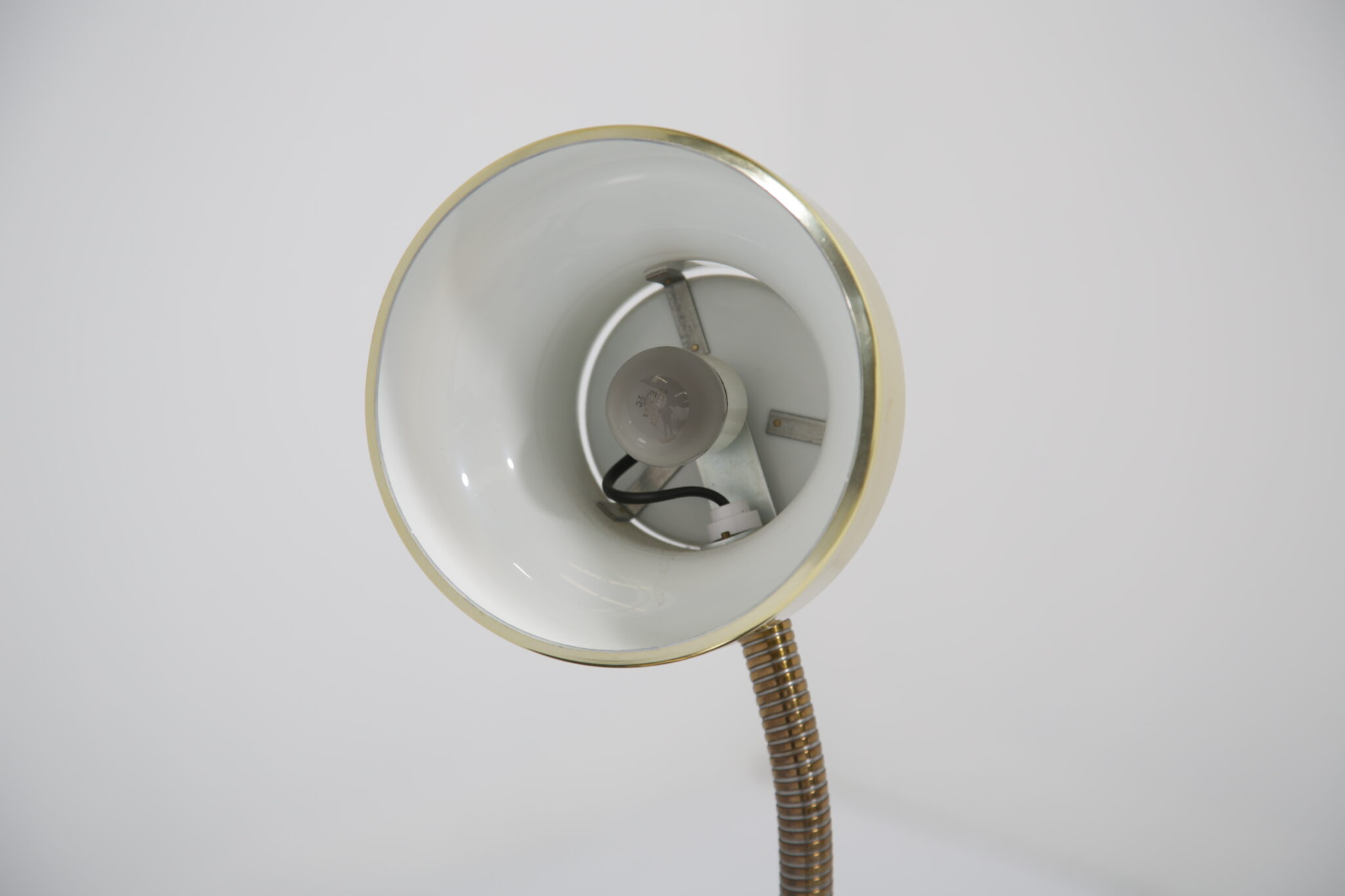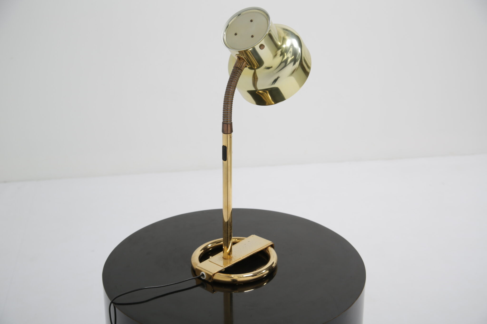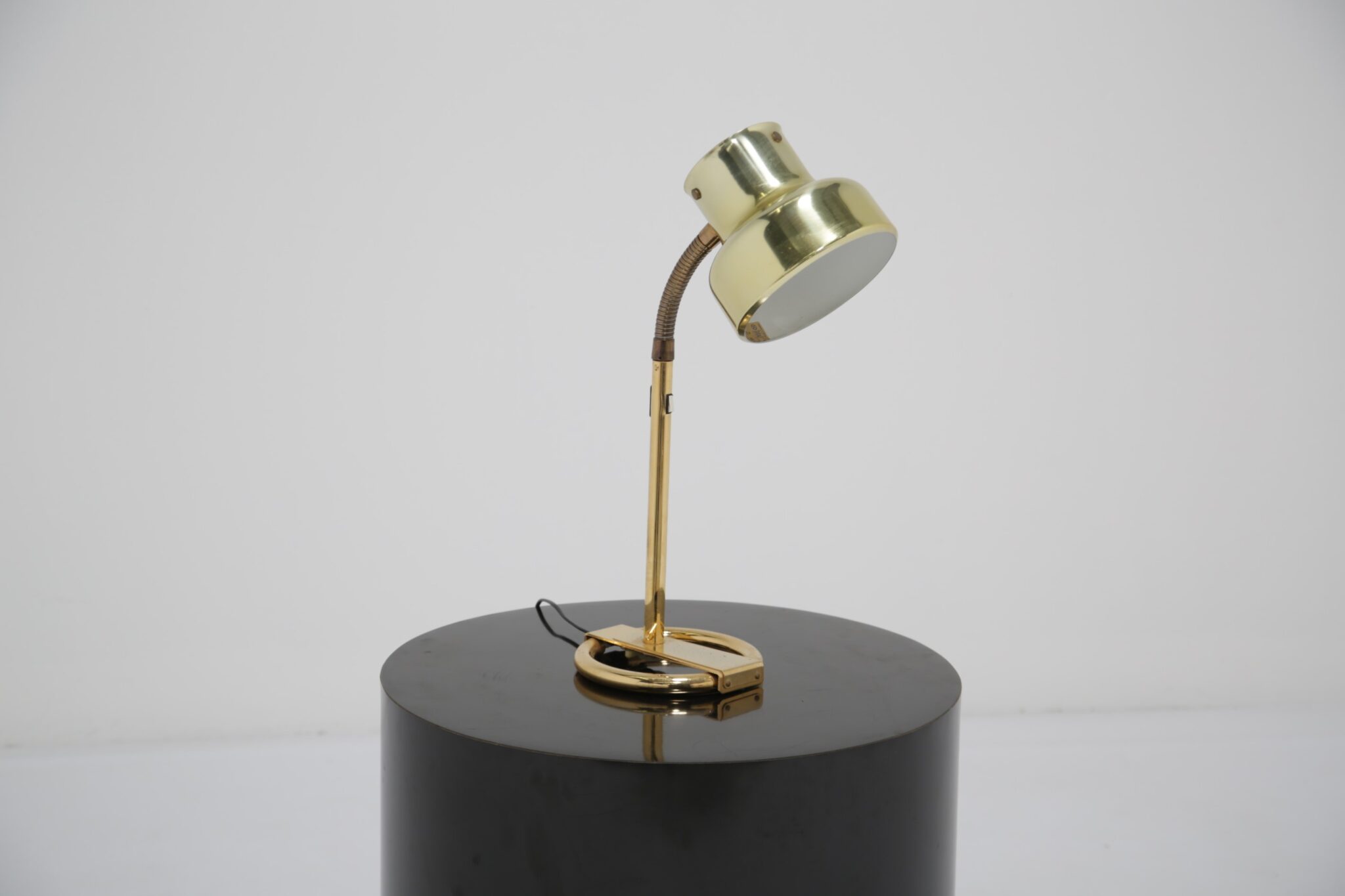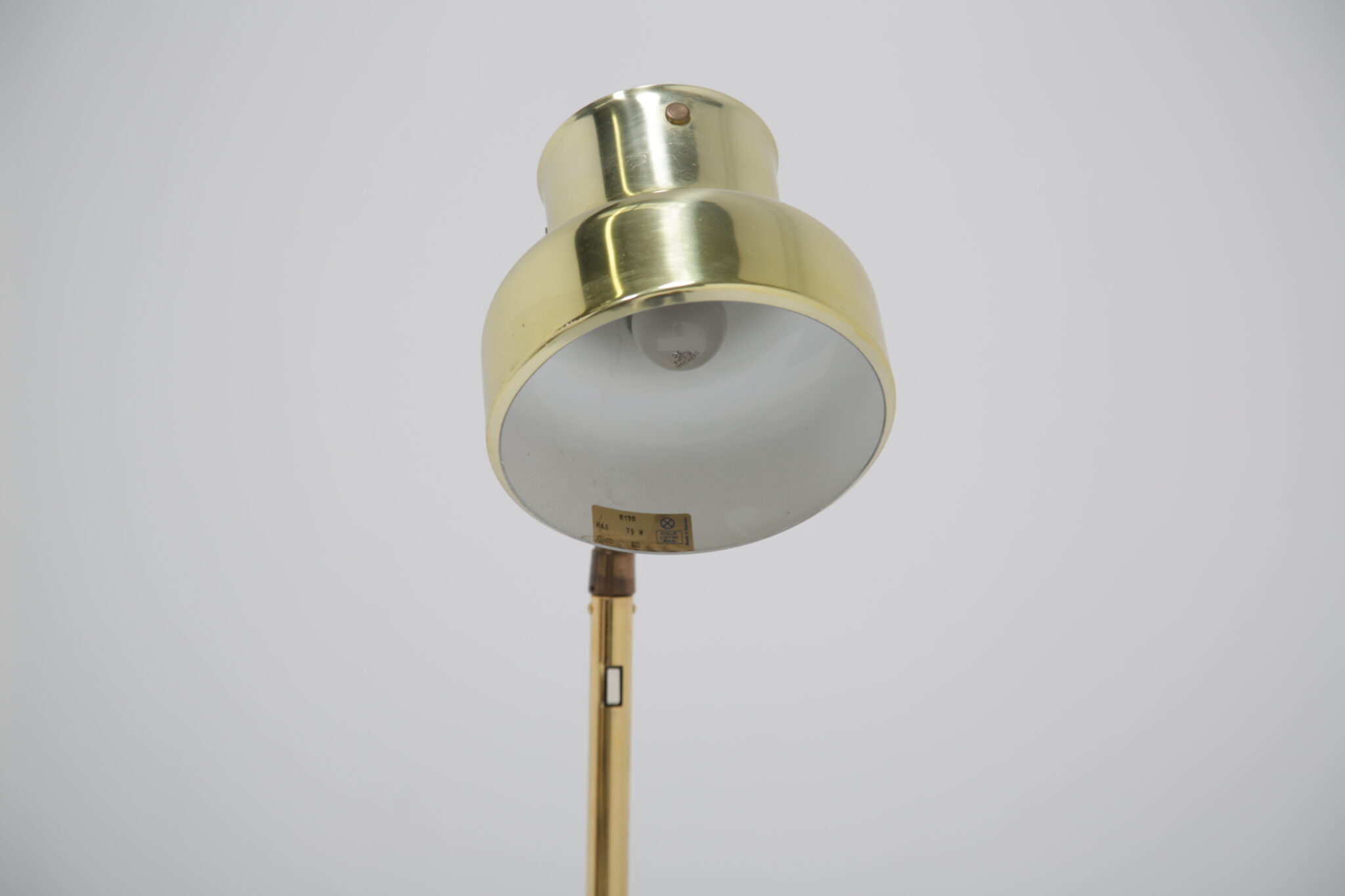 Add some vintage charm to your desk with this simple and beautiful desk lamp designed by the renowned Swedish lighting designer Anders Peherson for Atelje Lyktan (Translated to Studio Lighting). Dating back to the 1960s, but probably stretching into the 1970s this stunning desk lamp features a gold painted metal frame with a painted aluminum head. It illuminates the light nicely and would be perfect as a reading lamp.