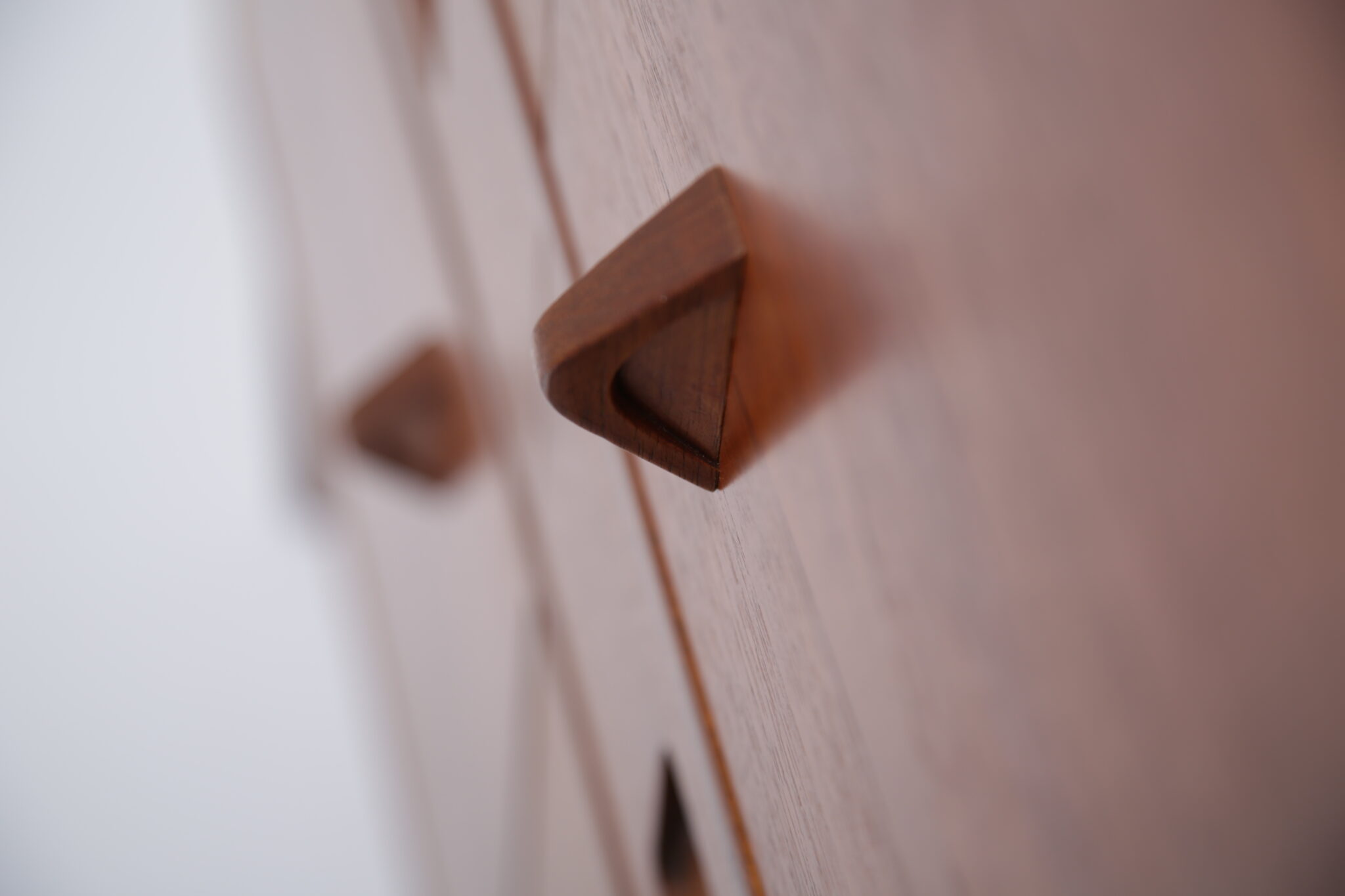 The design is minimalistic with clean lines, rounded legs but the sculpted handles stand out with nicely grooved out sides for the perfect grip. The left two cabinets both have fixed shelves whereas the right side has a fixed half shelf and one section that is fully open that would allow storage of larger vases, bottles, etc.
