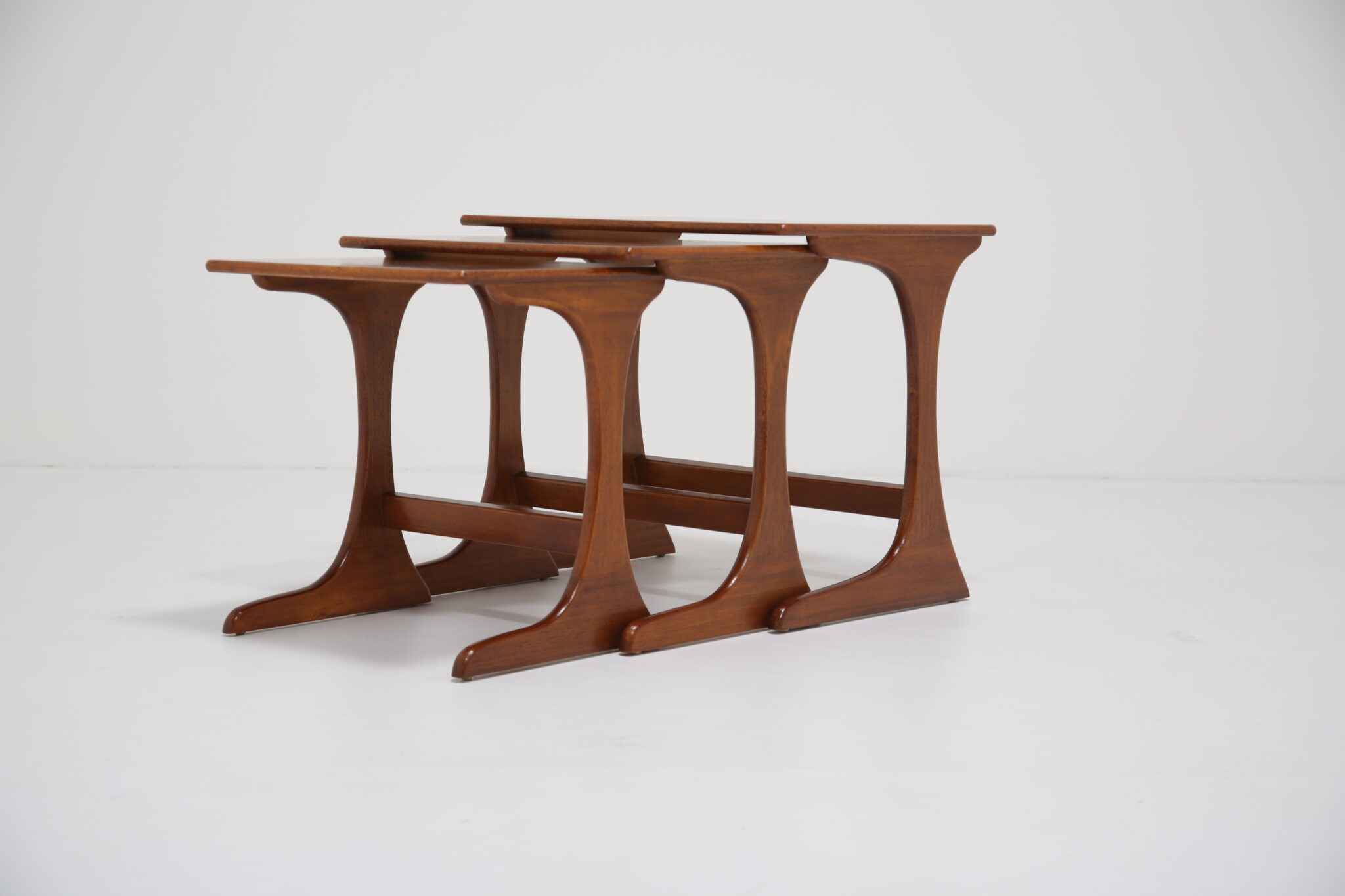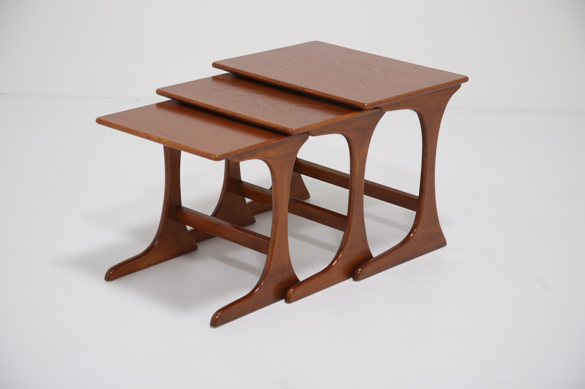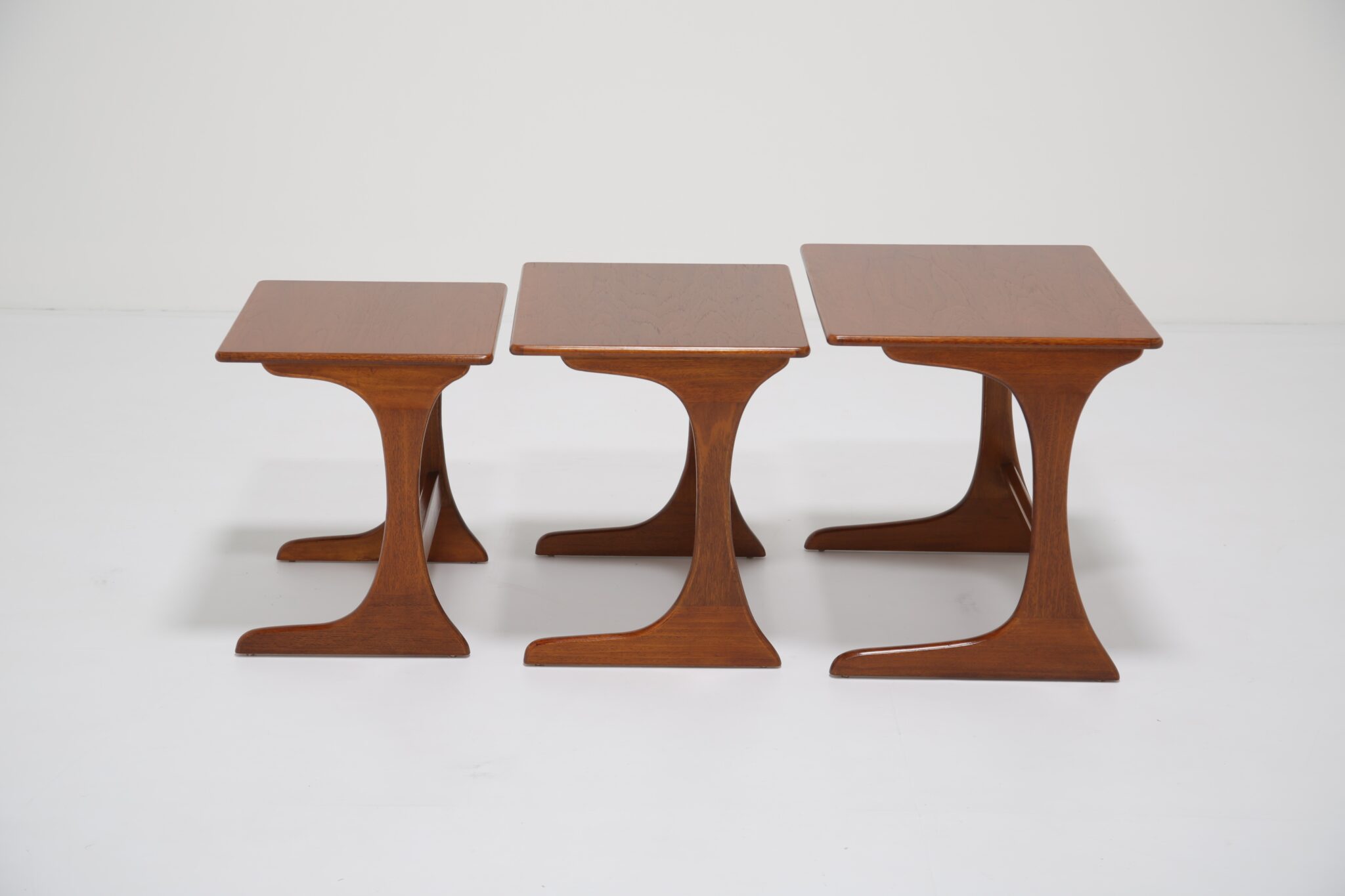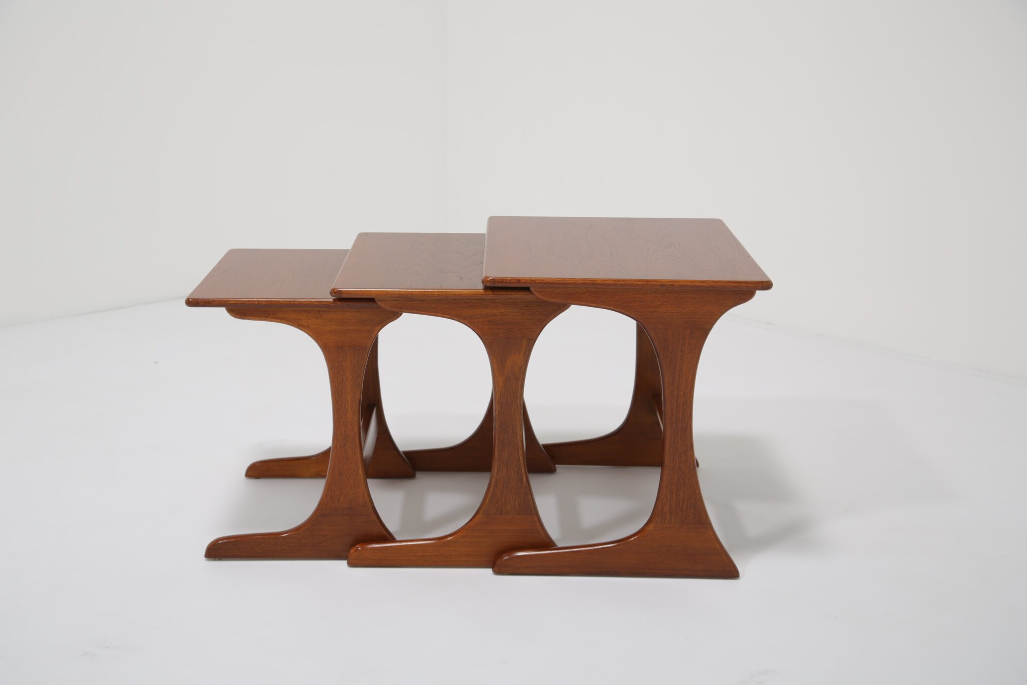 This elegant nest of teak tables, designed by Victor Wilkins for G Plan, is a versatile and stylish addition to any living space. The three tables nest neatly together, making them perfect for saving space when not in use and easily separate for extra surface area when needed. Crafted from warm-toned teak with clean, minimalist lines, these tables showcase the quality and timeless appeal of Scandinavian-influenced British design from the 1960s. Ideal for use as occasional tables, side tables, or coffee tables, they combine practical functionality with classic vintage style.