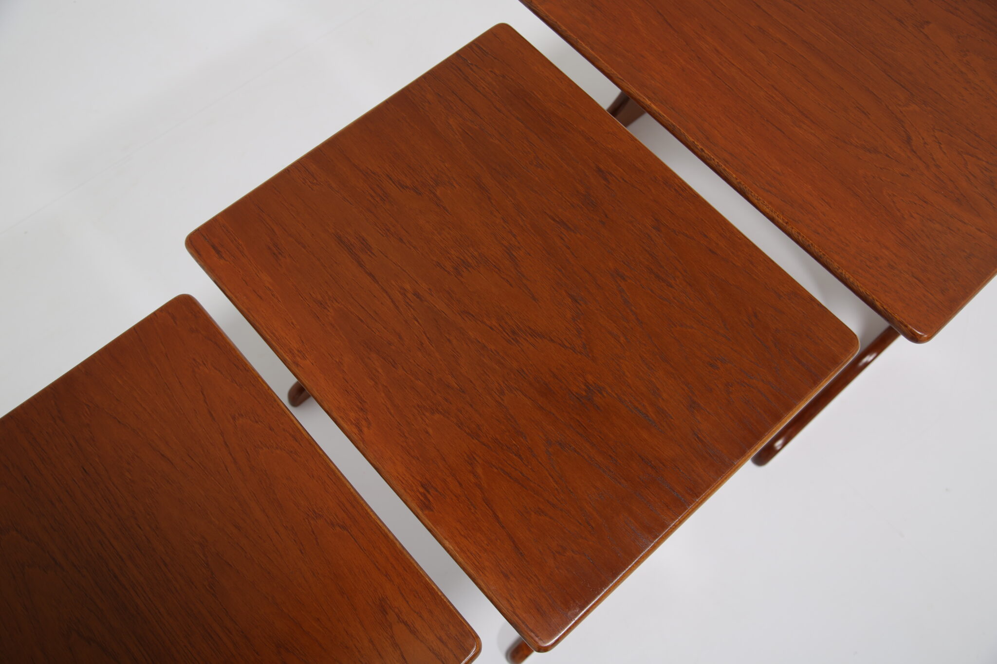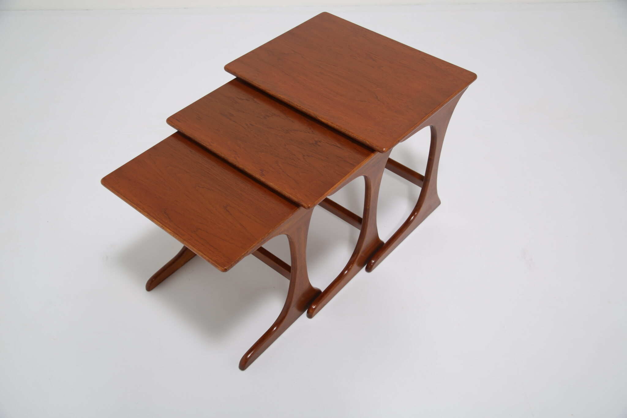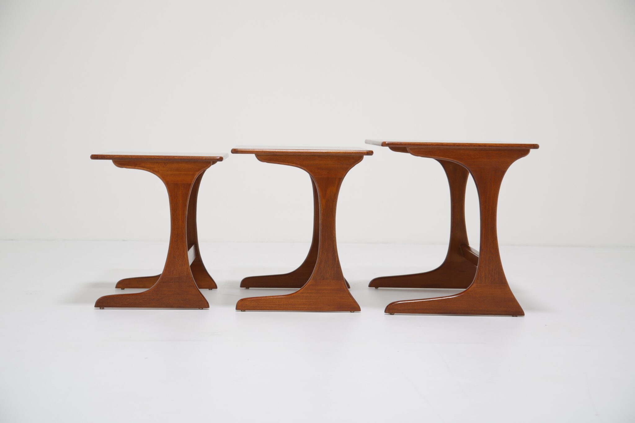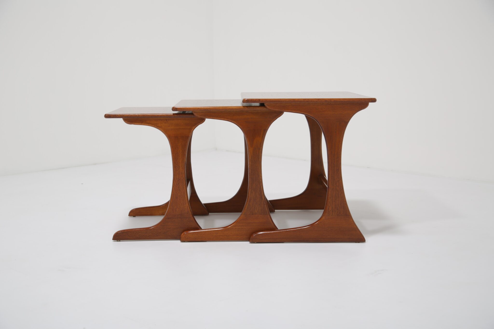 This elegant nest of teak tables, designed by Victor Wilkins for G Plan, is a versatile and stylish addition to any living space. The three tables nest neatly together, making them perfect for saving space when not in use and easily separate for extra surface area when needed. Crafted from warm-toned teak with clean, minimalist lines, these tables showcase the quality and timeless appeal of Scandinavian-influenced British design from the 1960s. Ideal for use as occasional tables, side tables, or coffee tables, they combine practical functionality with classic vintage style.